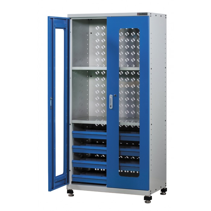◐특성 및 품질 1.슬라이드선반 및 고정선반을 동시 장착하여 제품유형별 보관가능 2.서랍 내부에는 이동식 칸막이로 분할가능하며 제품의 크기에 맞게 분할 보관가능 3.선반은 높낮이 조절가능(140mm 간격) 4.도어에 시건 장치를 부착하여 공구 및 측정장비의 도난방지 5.도어에 투명 아크릴을 부착하여 내부보임 6.조절발의 부착으로 높낮이조절 및 수평조절이 용이